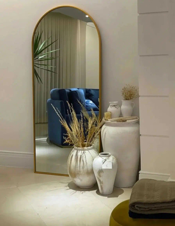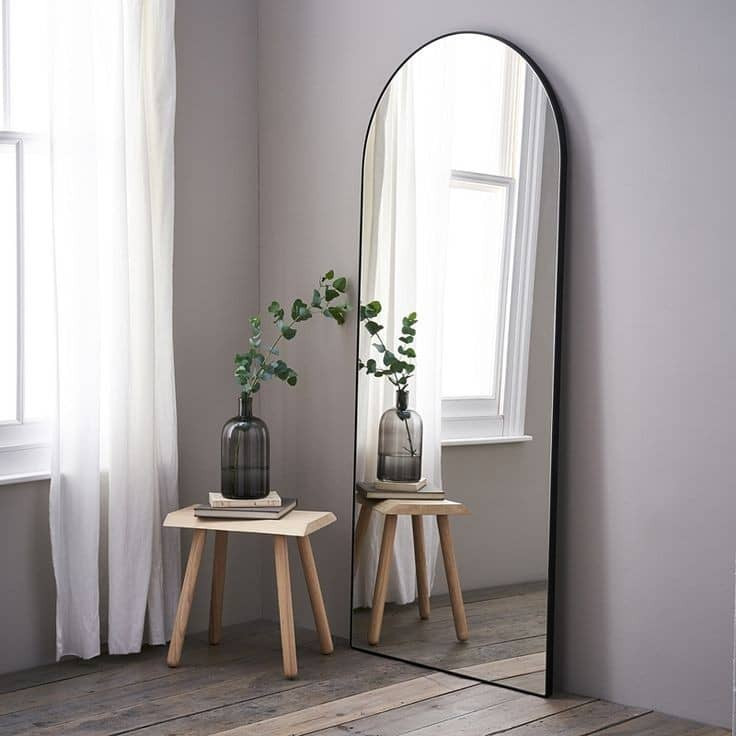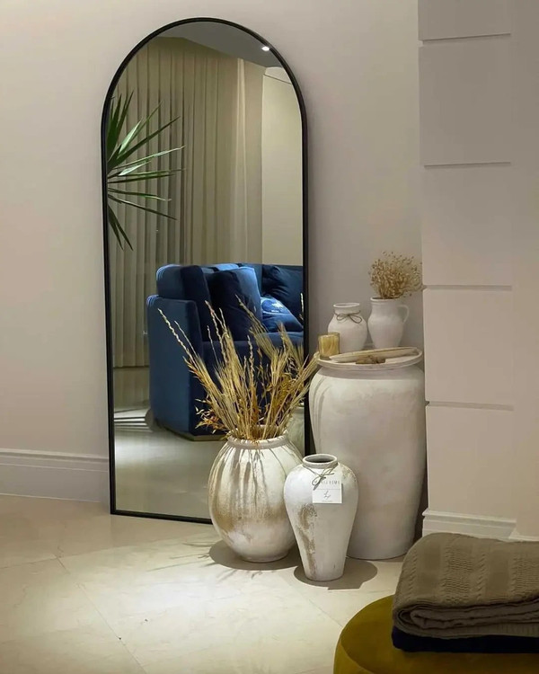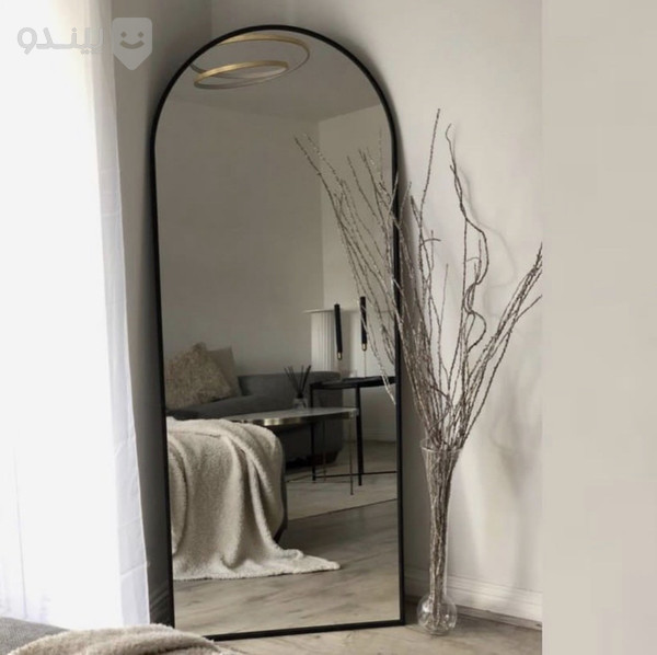 این تصویر مربوط به یک **آینه قدی قوسدار (آرچ)** با طراحی **مینیمال و مدرن** است که در دکوراسیونهای امروزی بسیار پرطرفدار شده. در این صحنه، آینه ویژگیهای شاخص زیر دارد: