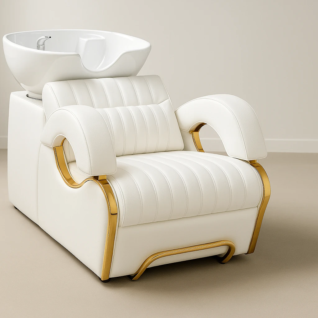 سرشور لوکس مشکیطلایی، با بدنه چرمی مقاوم و لمسهدوزی منظم. کاسهی سرامیکی مشکی براق، ارگونومیک و راحت برای مشتری. طراحی خمهای طلایی، ظاهر بسیار شیک و لاکچری به فضا میدهد. مناسب سالنهای حرفهای که دنبال کیفیت و جلوهی متفاوت هستند.